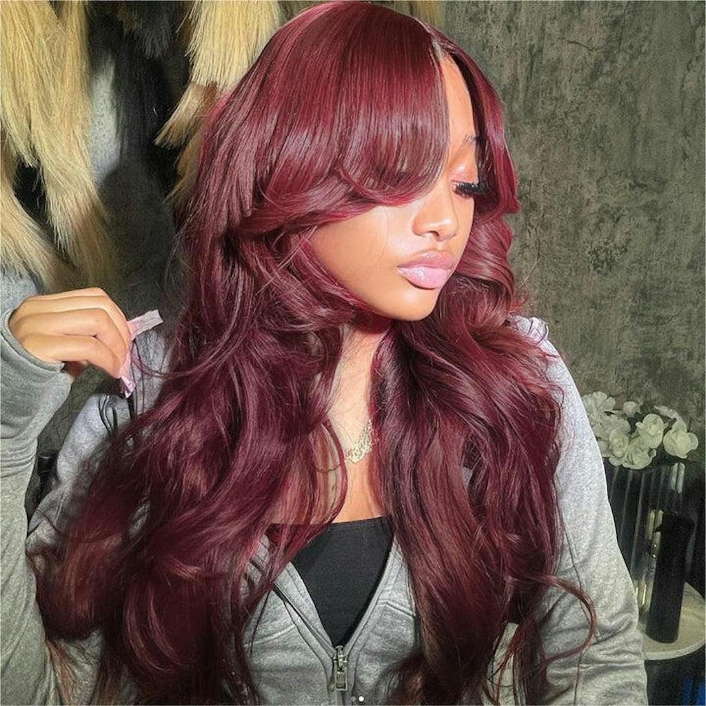7×5/5×5 Lace Curtain Bangs Glueless Wigs 99J Burgundy Body Wave Human Hair Wig Wear Go HD Lace Wig