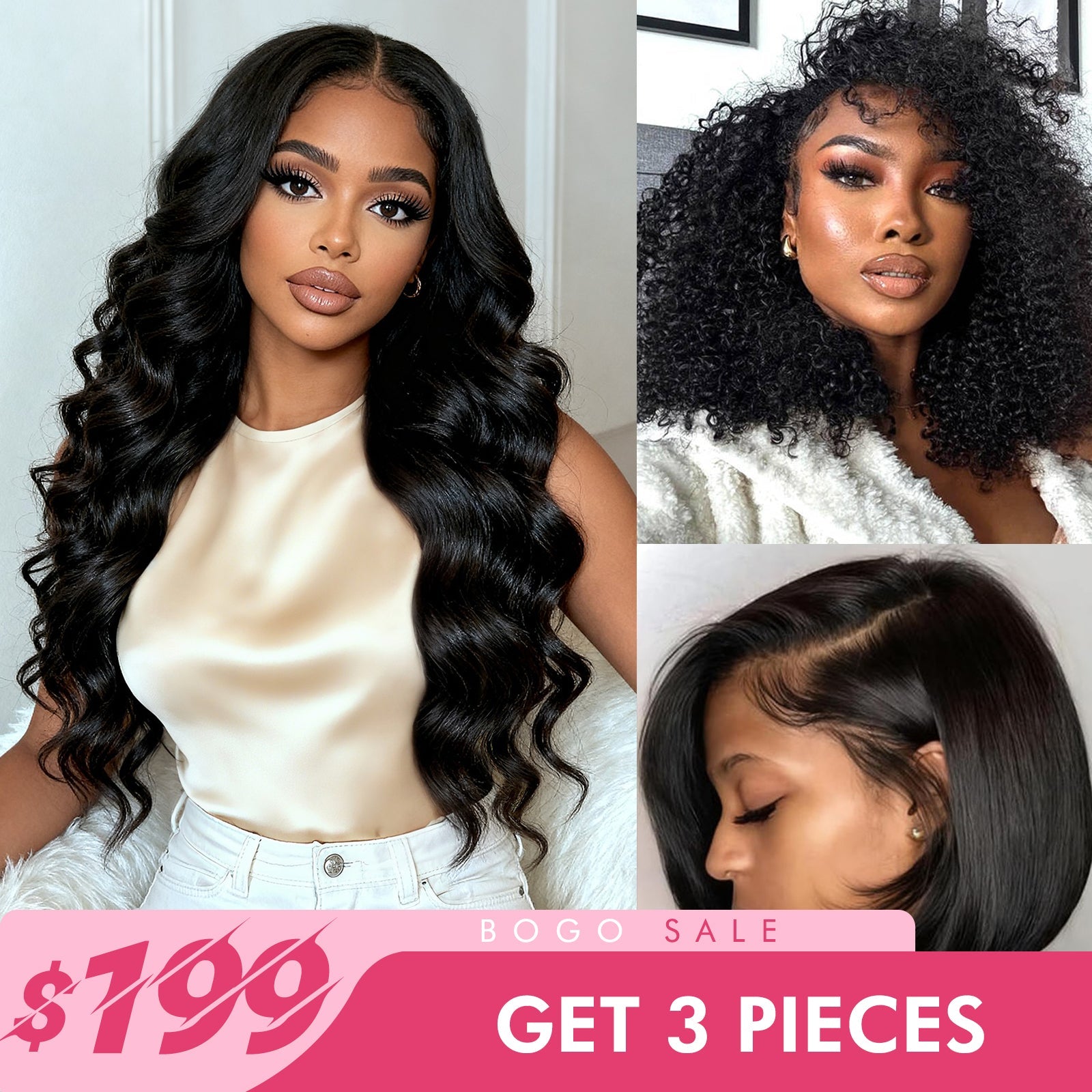 $199=3 Wigs| 18" Body Wave 13x4 Lace Wig + 10" Short Bob 13x4 Lace Wig + 14" Curly Glueless Half Wig Subscriber Exclusive Flash Sale