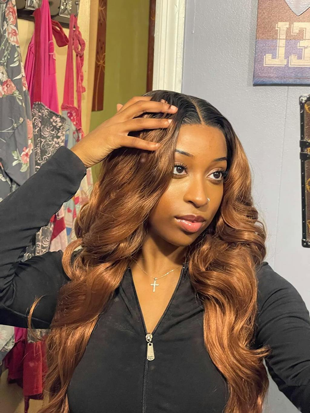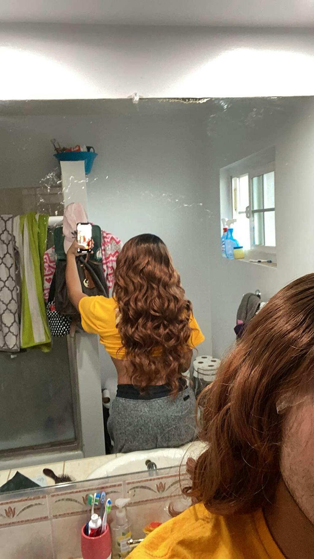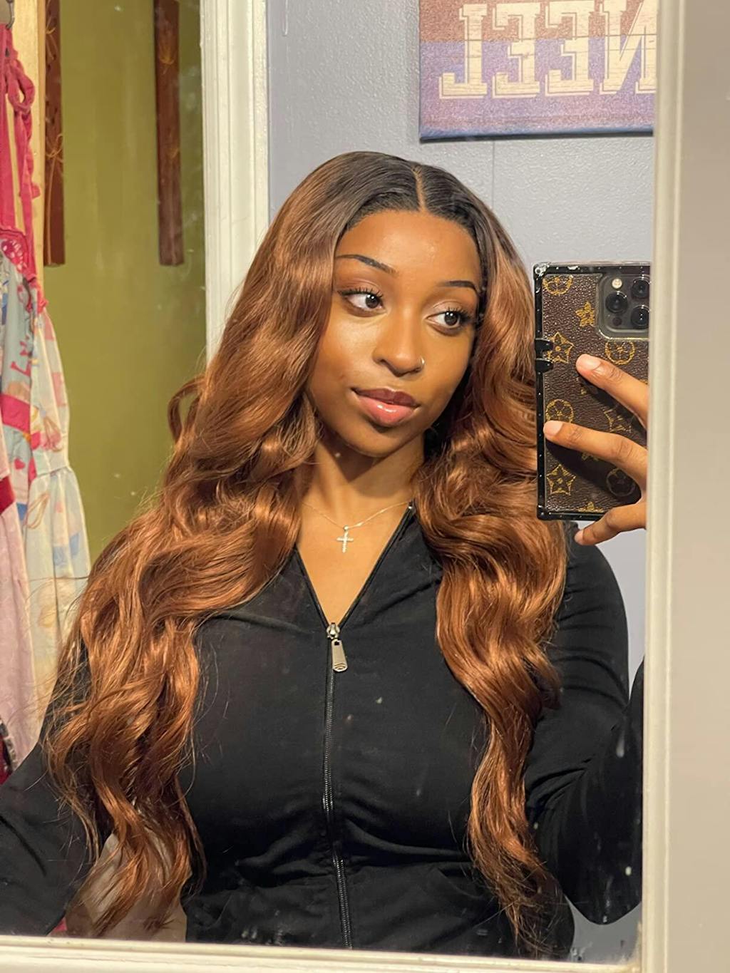 I took my pictures in two different lightings so it can be seen in natural or inside lighting. It’s very soft and natural feeling/looking. I like the band to keep it place too. Overall I recommend this wig especially for the price 👍🏼